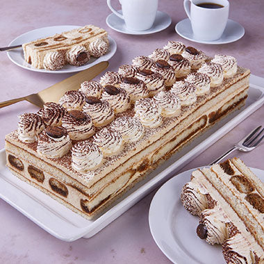 A delightful Tiramisu Bar Cake infused with coffee, layered with creamy bavarois filling, sponge fingers, and biscuit dusted with cocoa powder. This cake offers an authentic tiramisu experience, perfect for dessert lovers.