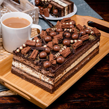Contents: Dark & White Chocolate Mousse layered between cocoa sponges, topped with chocolate filling.